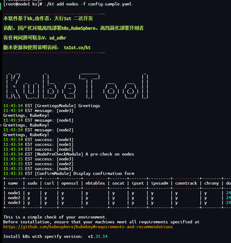 这里使用kt独有的一键初始化所有节点能力./kt init-os -f config-sample.yaml