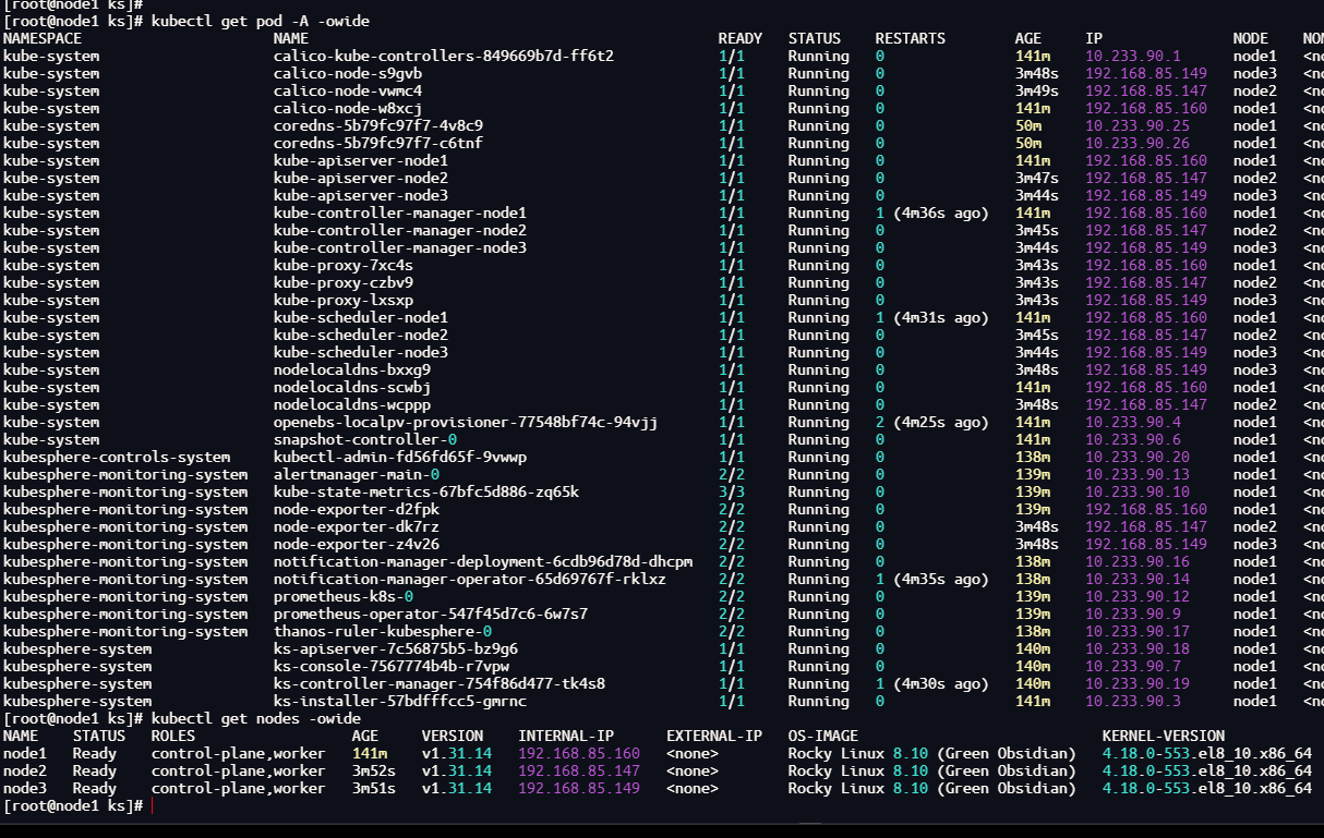 上一篇文章使用k8s 1.31.14+ks3.4.1部署了all-in-one,本文将演示在all-in-one基础上由1个节点扩展为3个master节点。