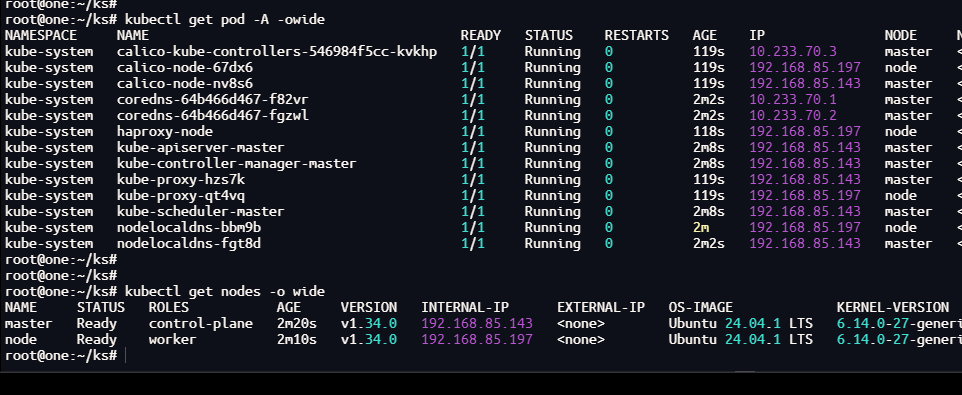 为例,演示如何在一台机器使用4条简短的命令部署k8s 1.34.0