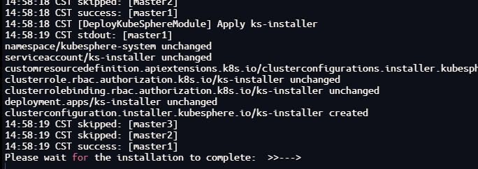 kubectl logs -n kubesphere-system $(kubectl get pod -n kubesphere-system -l 'app in (ks-install, ks-installer)' -o jsonpath='{.items[0].metadata.name}') -f