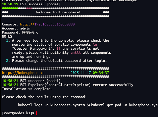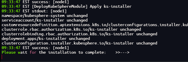 kubectl logs -n kubesphere-system $(kubectl get pod -n kubesphere-system -l 'app in (ks-install, ks-installer)' -o jsonpath='{.items[0].metadata.name}') -f