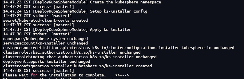 kubectl logs -n kubesphere-system $(kubectl get pod -n kubesphere-system -l 'app in (ks-install, ks-installer)' -o jsonpath='{.items[0].metadata.name}') -f